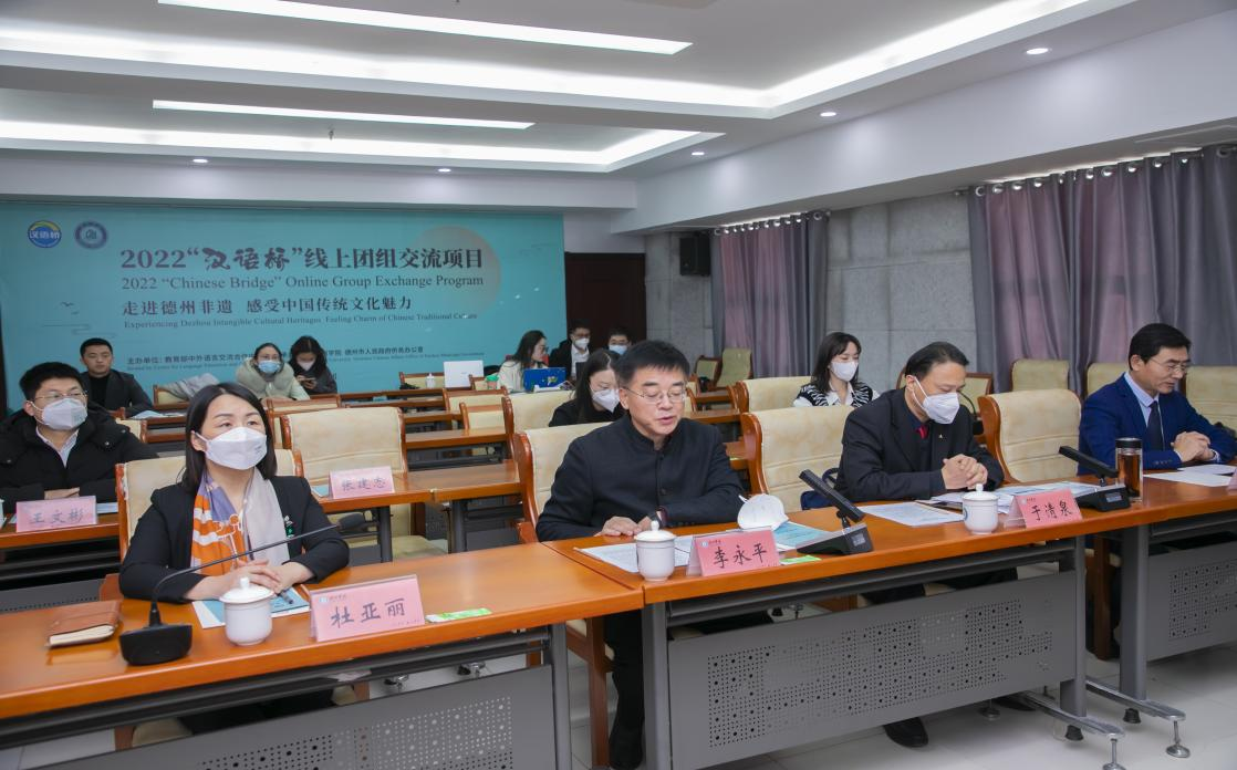 1月6日上午,2022年“汉语桥”线上团组交流项目“走进德州非遗,感受中国传统文化魅力”开营式在999策略白菜手机论坛举行。本次活动由教育部中外语言交流合作中心主办,999策略白菜手机论坛、德州市人民政府侨务办公室承办。柬埔寨中英国际学校总经理范惠能,印度尼西亚吉祥山三语学校基金会主任丘建毅,德州市人民政府侨务办公室主任于清泉,999策略白菜手机论坛党委委员、副校长李永平出席活动。