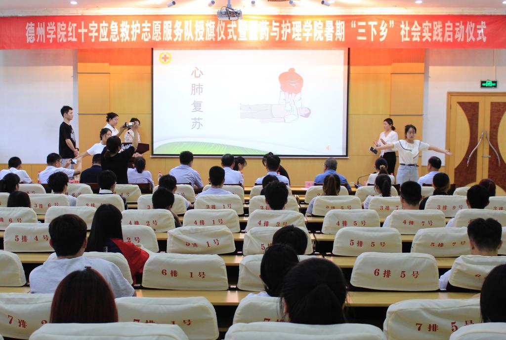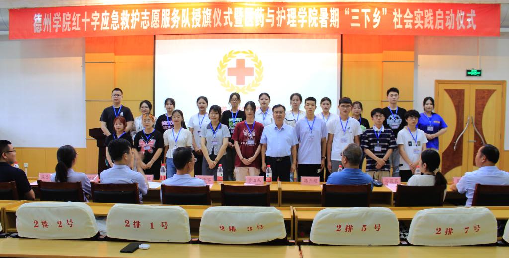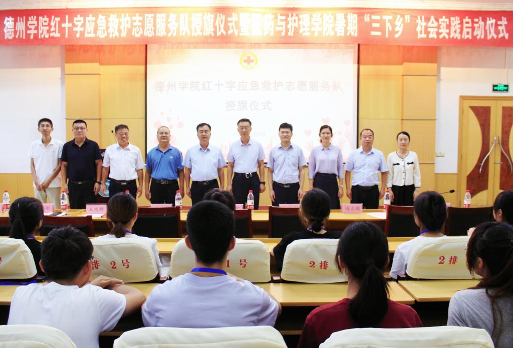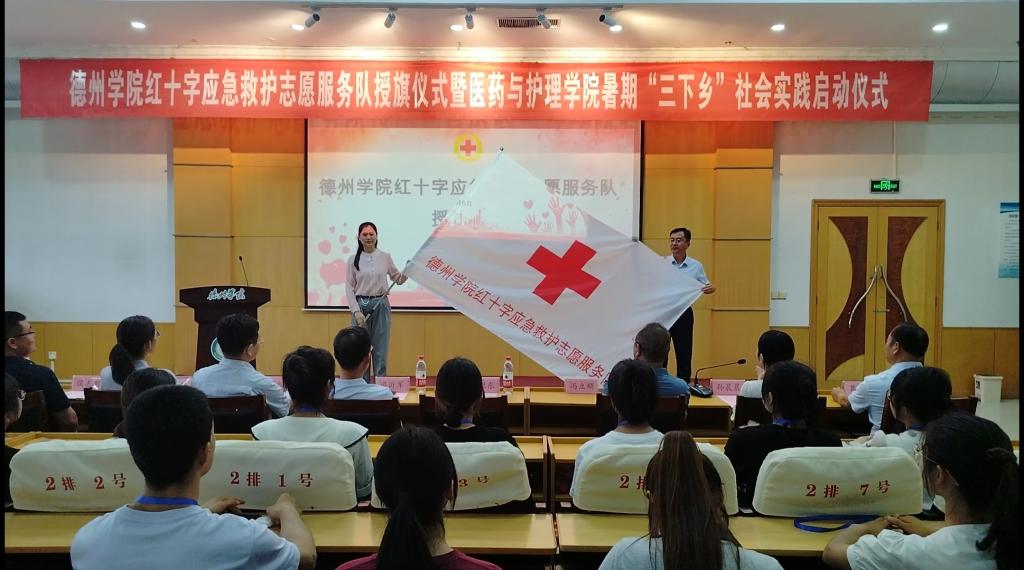 为弘扬“人道、博爱、奉献”的红十字精神和“奉献、友爱、互助、进步”的志愿服务精神,更好地推进暑期“三下乡”社会实践活动深入开展。7月6日下午,医药与护理学院于厚德楼四楼报告厅举办999策略白菜手机论坛红十字应急救护志愿服务队授旗仪式暨暑期“三下乡”社会实践启动仪式。999策略白菜手机论坛党委委员、副校长迟沂军、德州市红十字会常务副会长李福辉、德州市红十字会党组成员、副会长黄卫东出席,校团委、医药与护理学院相关负责人、市红十字会应急救护培训中心相关负责人及学生志愿者共百余人参加。