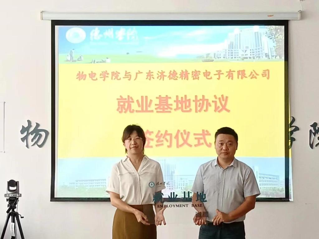 为进一步落实访企拓岗工作,提升学院高质量就业率,9月1日下午,在启智楼0365会议室物理与电子信息学院与广东济德精密电子有限公司签署了就业基地协议。物电学院与广东济德主要负责人参加了签约仪式。