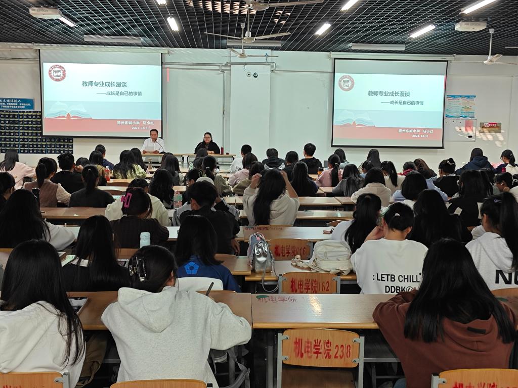 讲座邀请了德州市东城小学的马小红校长主讲,马小红围绕习近平总书记对建设教育强国的重要论述的解读、教师职业规范、新课标视野下教师能力需求、教师自主成长密码四个方面展开讲解,对当今教育强国的重要任务和意义、教育的有效方式、教师工作新要求进行了详细论述,让学生更加明确教师的职业需求和努力的方向。马校长的讲座内容丰富,结合案例,深入浅出,形象生动。在座的师生认真听讲,积极参与互动,并且踊跃回答问题,现场气氛热烈。